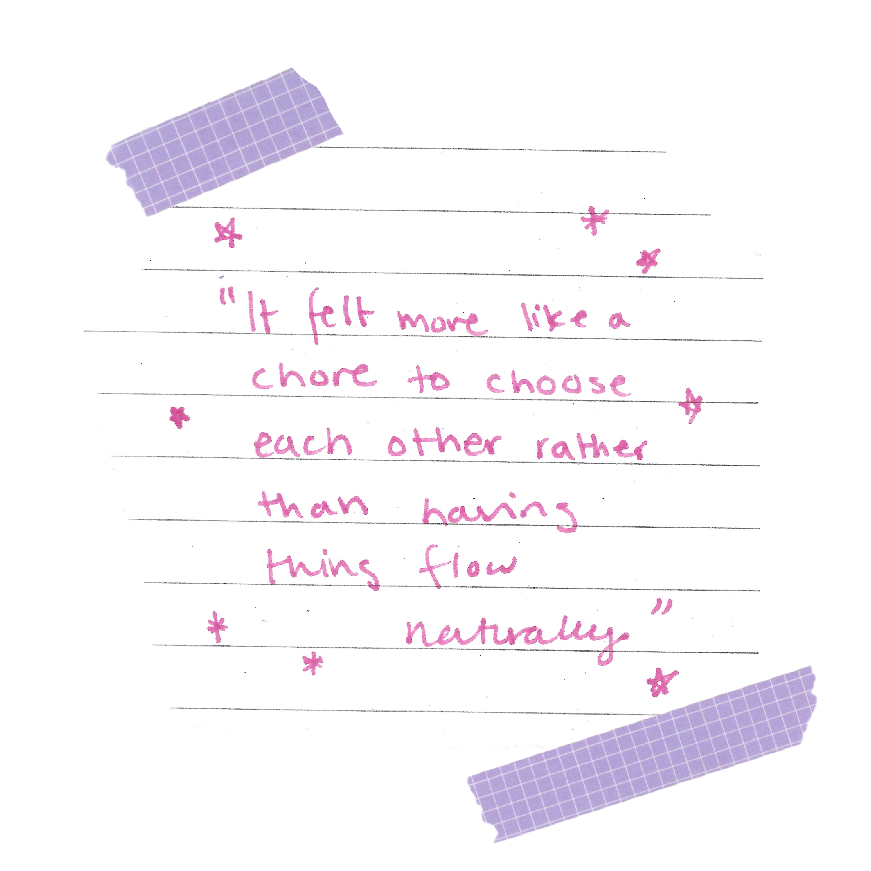 Coronado says she sometimes wondered if she was missing out on experiences or friendships because of her relationship. “It felt more like a chore to choose each other rather than having things flow naturally.”