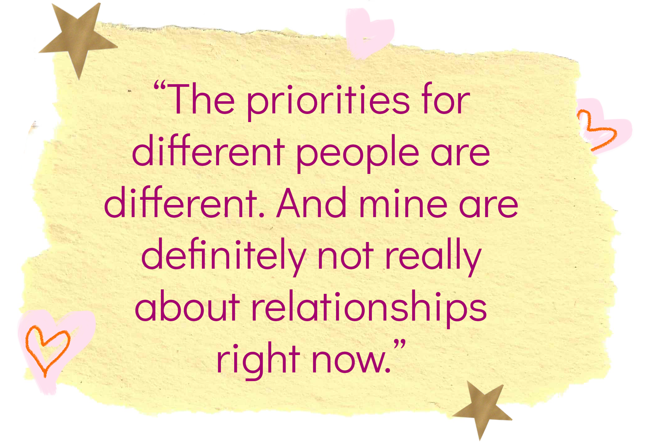 Adding a relationship on top of her existing commitments would be too much for her schedule and it would require emotional energy that she’s not willing to expend. “My school and my extracurriculars rely on me being able to be creative and emotionally invested,” she says. “I can’t be worrying about my personal relationships.”